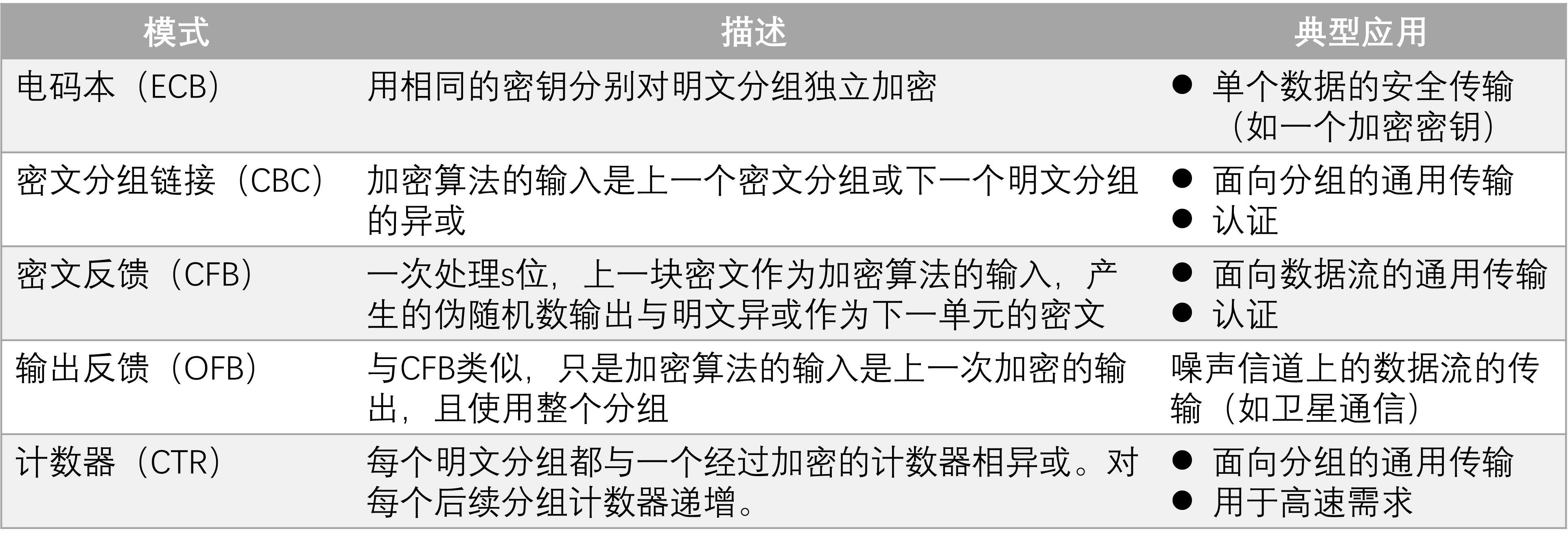 分组密码算法每次只能处理特定长度的一块数据,实际上明文的长度通常都不是固定的,因此需要对明文进行分块,用分组密码进行迭代处理,最终将明文全部加密。具体的迭代模式就是分组密码的工作模式。NIST 定义了分组密码的五种“工作模式”,覆盖了大量使用分组密码的应用。