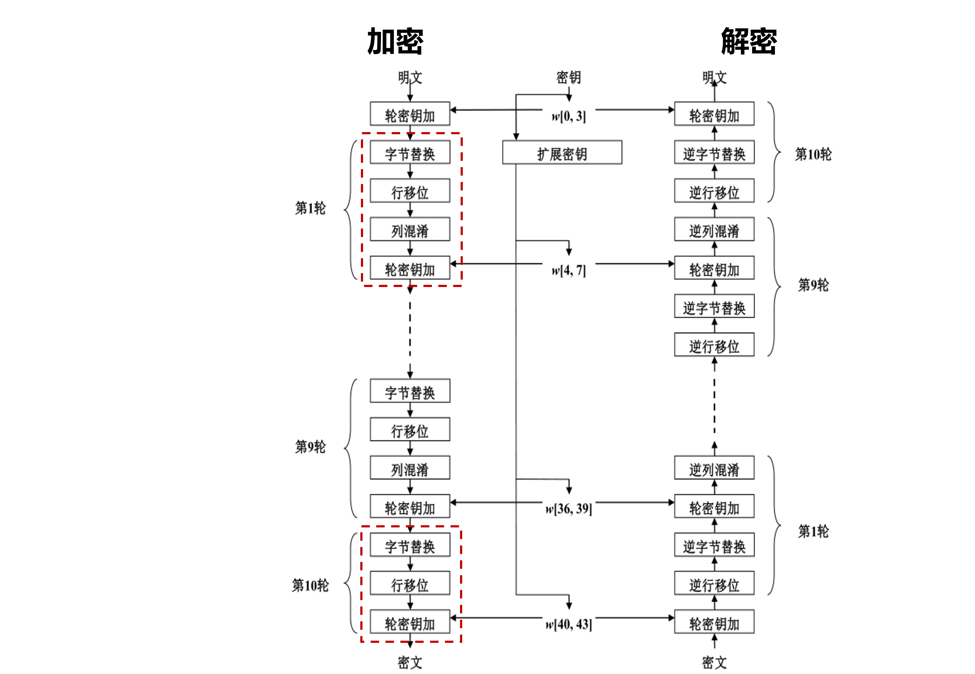 AES 密码算法主要有四种运算,分别为字节替换,行移位,列混淆和轮密钥加;前面三种运算只处理明文,最后一个运算轮密钥加才和密钥进行运算,因为要解密所以这四种运算都是可逆的。10 轮的 AES 密码算法(AES128)过程如下图所示。