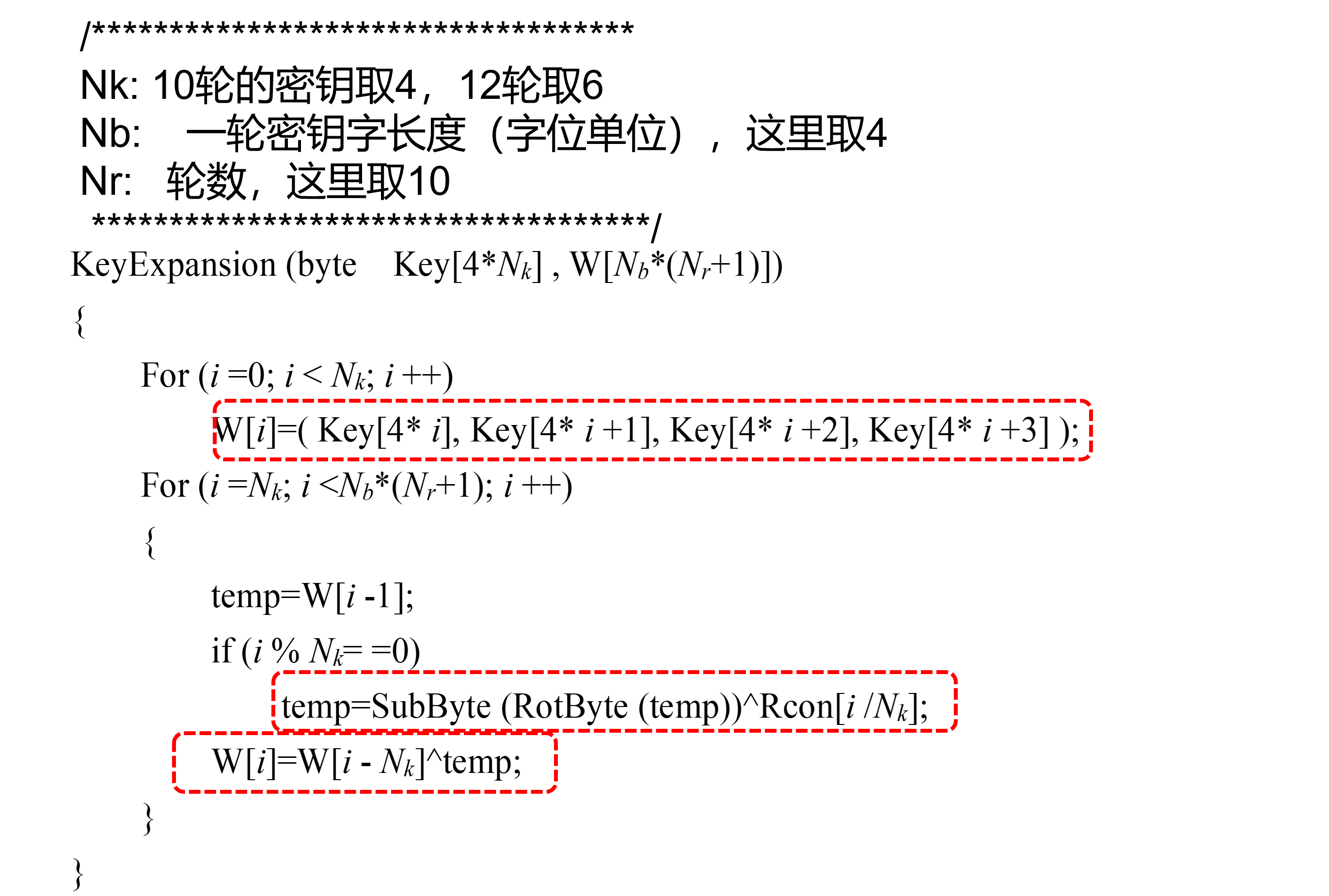 由 4 个字(16 个字节)的种子密钥,生成一个 44 个字(1 个字 = 4 个字节 = 32 bits)的一维线性数组。初始化加上 10 次轮密钥加,每次用 4 个字。