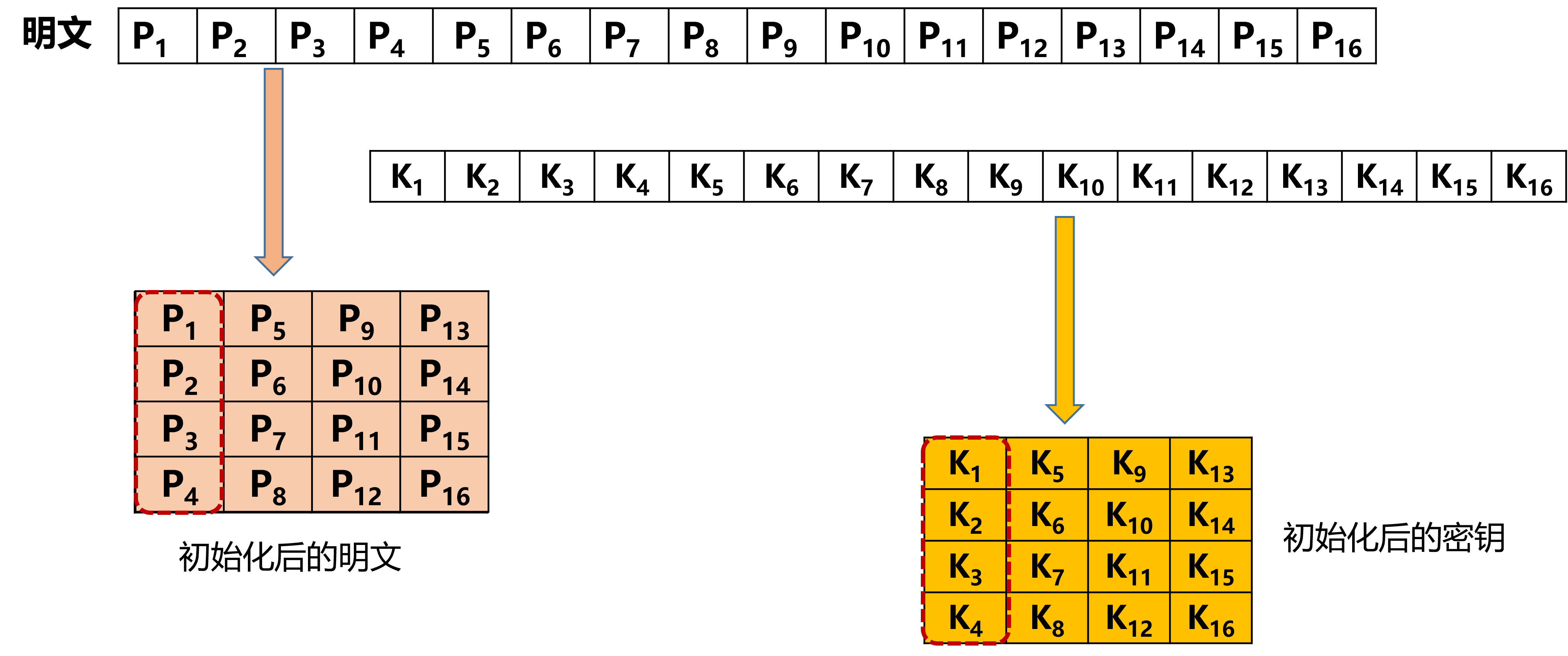 AES 中的运算都是以字节位单位的,128 位的明文可以分为 16 个字节,与一般的存储方式不同,这里的字节是**按列存储**的。密钥的初始化也与明文初始化相同,128 位的密钥分为 16 个字节**按列存储**,如下图所示。