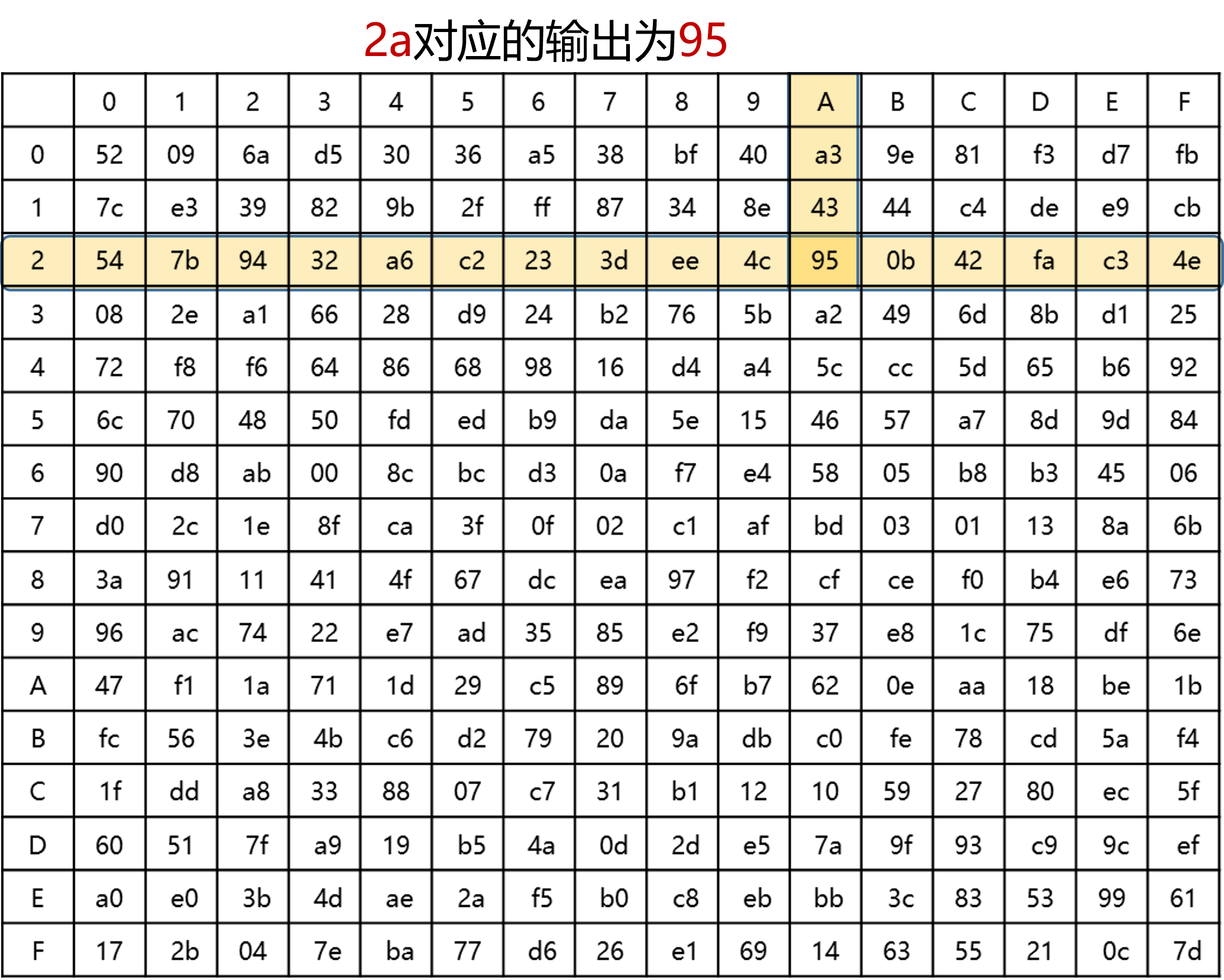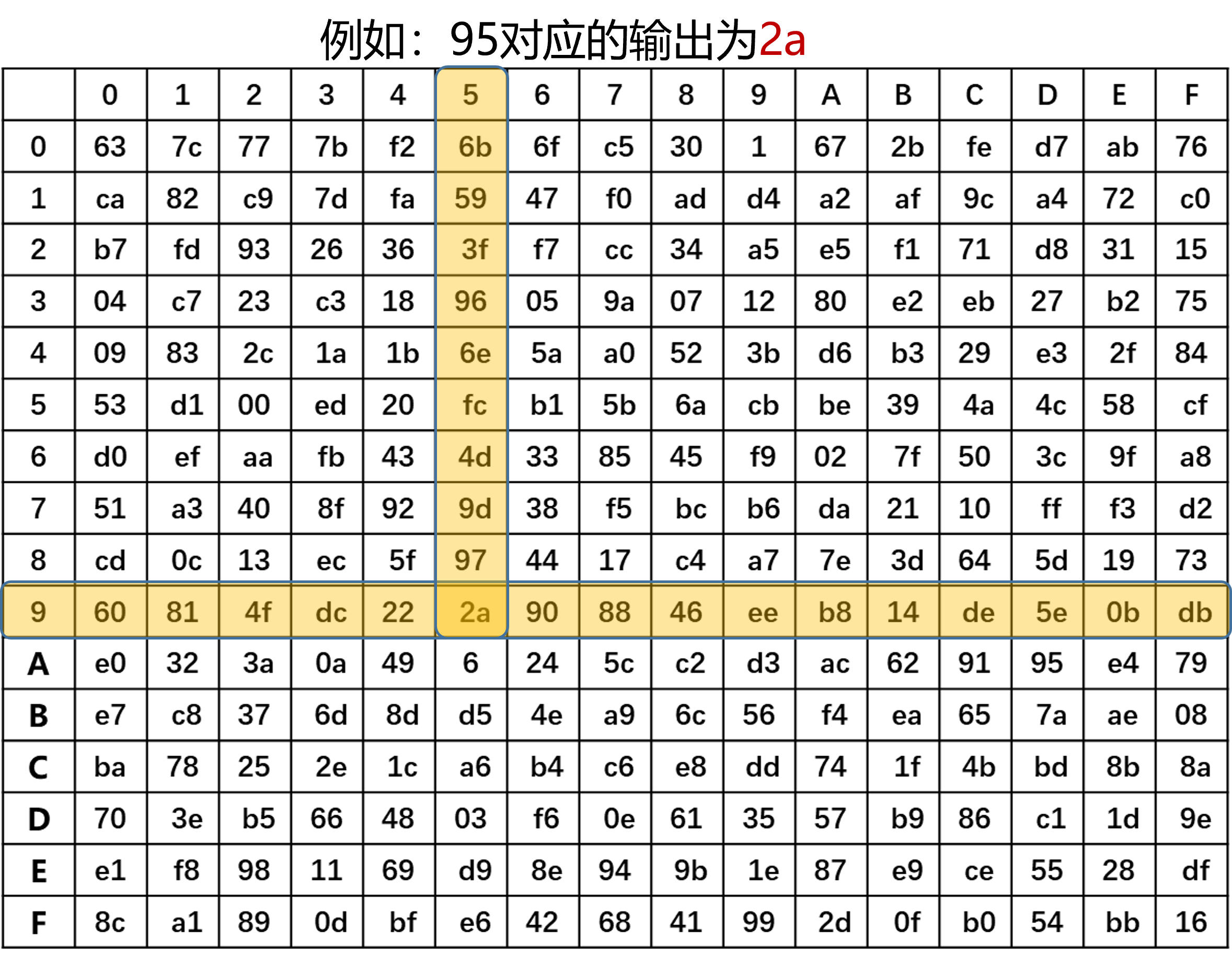 本次实验不需要大家生成 S 盒,字节替换和逆字节替换的运算,只需要查找 S 盒和逆 S 盒中对应的元素作为输出即可。查找的方法为字节的**高 4 位作为行号**,低 4 位作为列号,对应 S 盒和逆 S 盒的元素则为需要替换的内容。以 95<->2a 为例 (16 进制表示), 如下图所示。