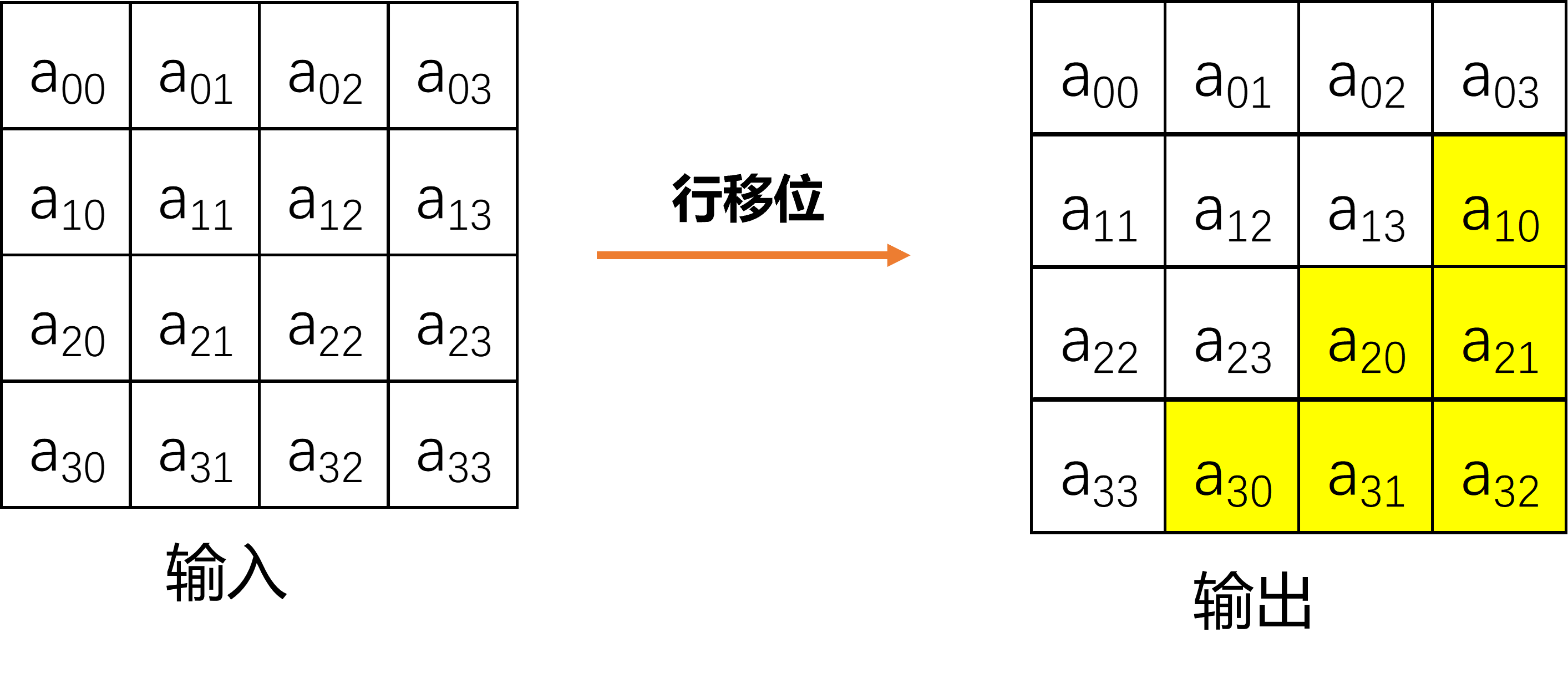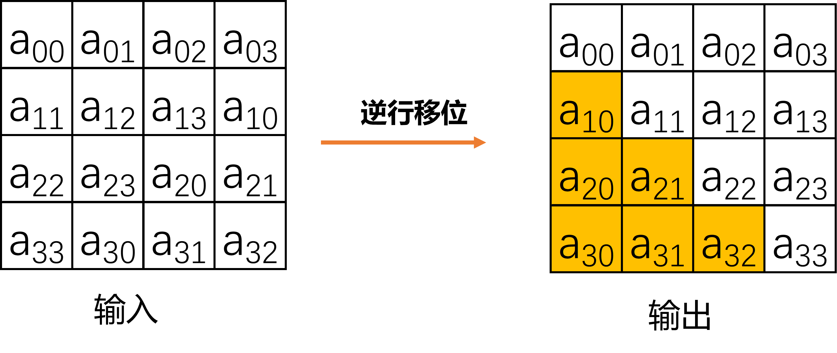 行移位是每行**按字节**移位(提醒大家注意,AES 算法中的处理都是以字节为单位的),第 1 行保持不变,第 2 行循环左移 1 个字节,第 3 行循环左移 2 个字节,第 4 行循环左移 3 个字节,完成行移位后每一列的四个字节被扩散到 4 个不同的列。逆行移位则与之相反,第 1 行保持不变,第 2 行循环右移 1 个字节,第 3 行循环右移 2 个字节,第 4 行循环右移 3 个字节。如下图所示。