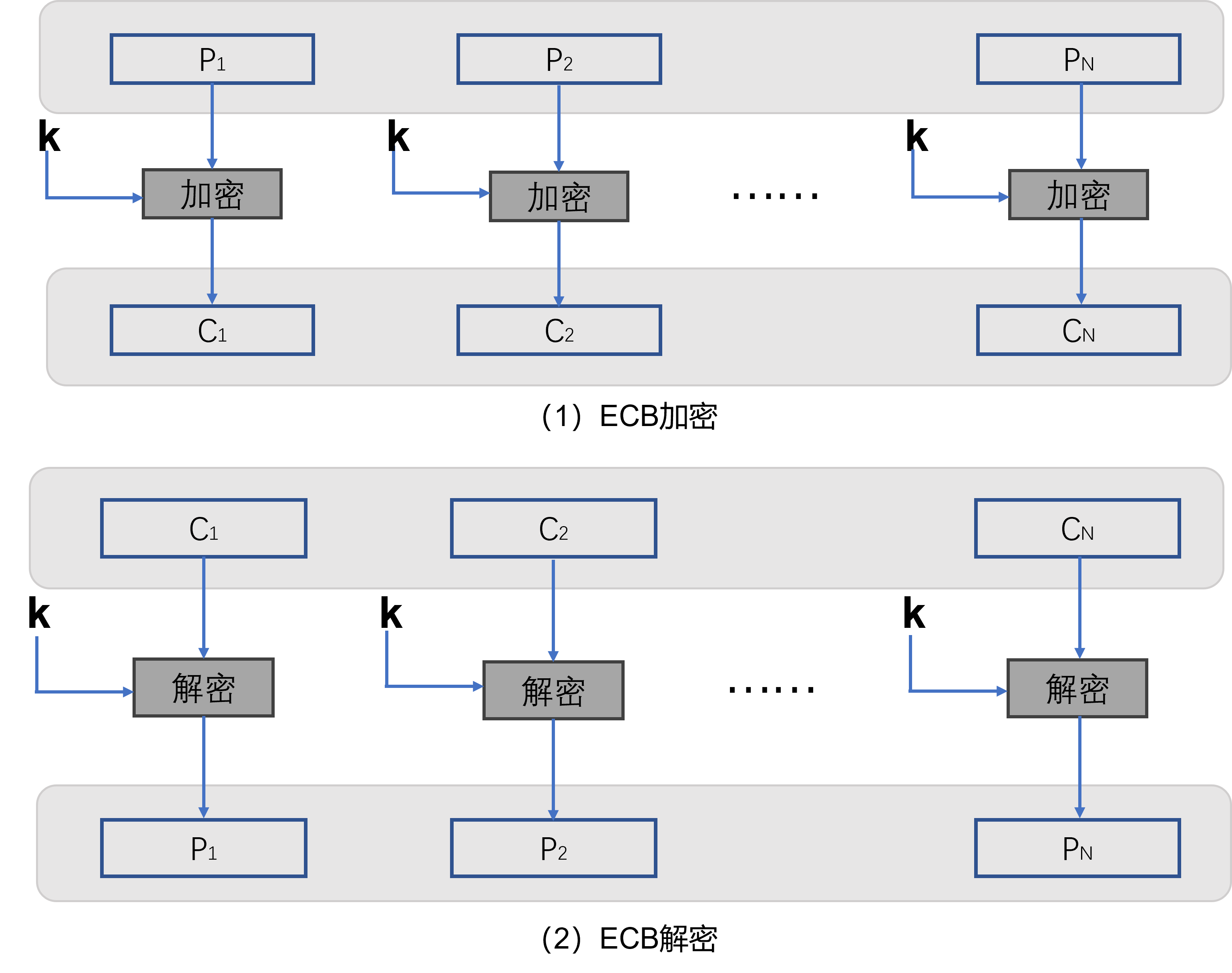电码本模式(Electronic Codebook Book,简称 ECB):将明文按 16 个字节分组,每组分别加密后再拼接在一起就是加密后的明文。其缺点是如果分组的明文相同,那么对应的密文也将相同。因此常用于比较短的数据加密,比如密钥的加密。
