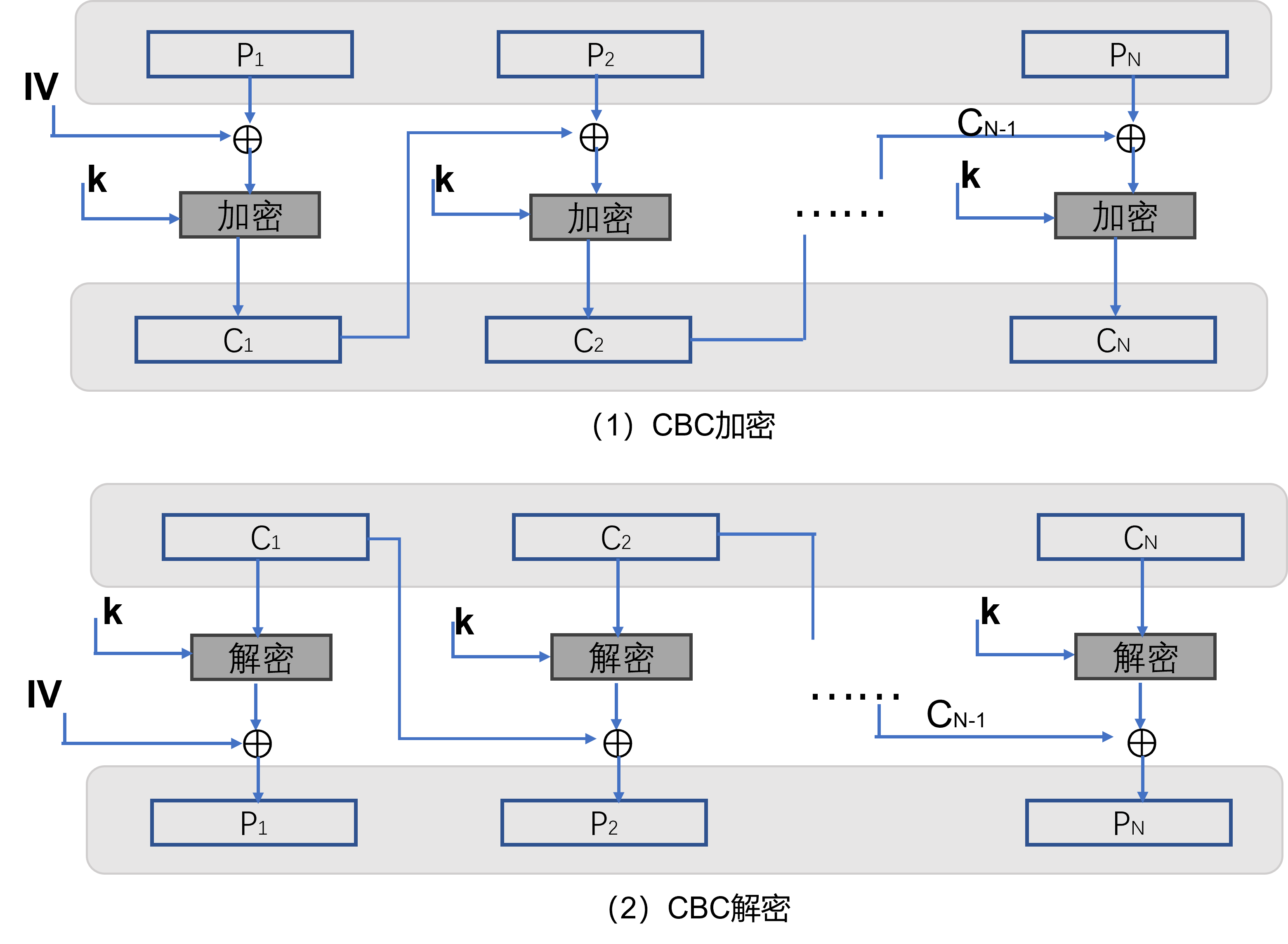 P 代表明文,Pi 代表第 i 个明文分组,C 代表密文,Ci 代表第 i 个密文分组,K 代表密钥,IV 代表初始化向量。