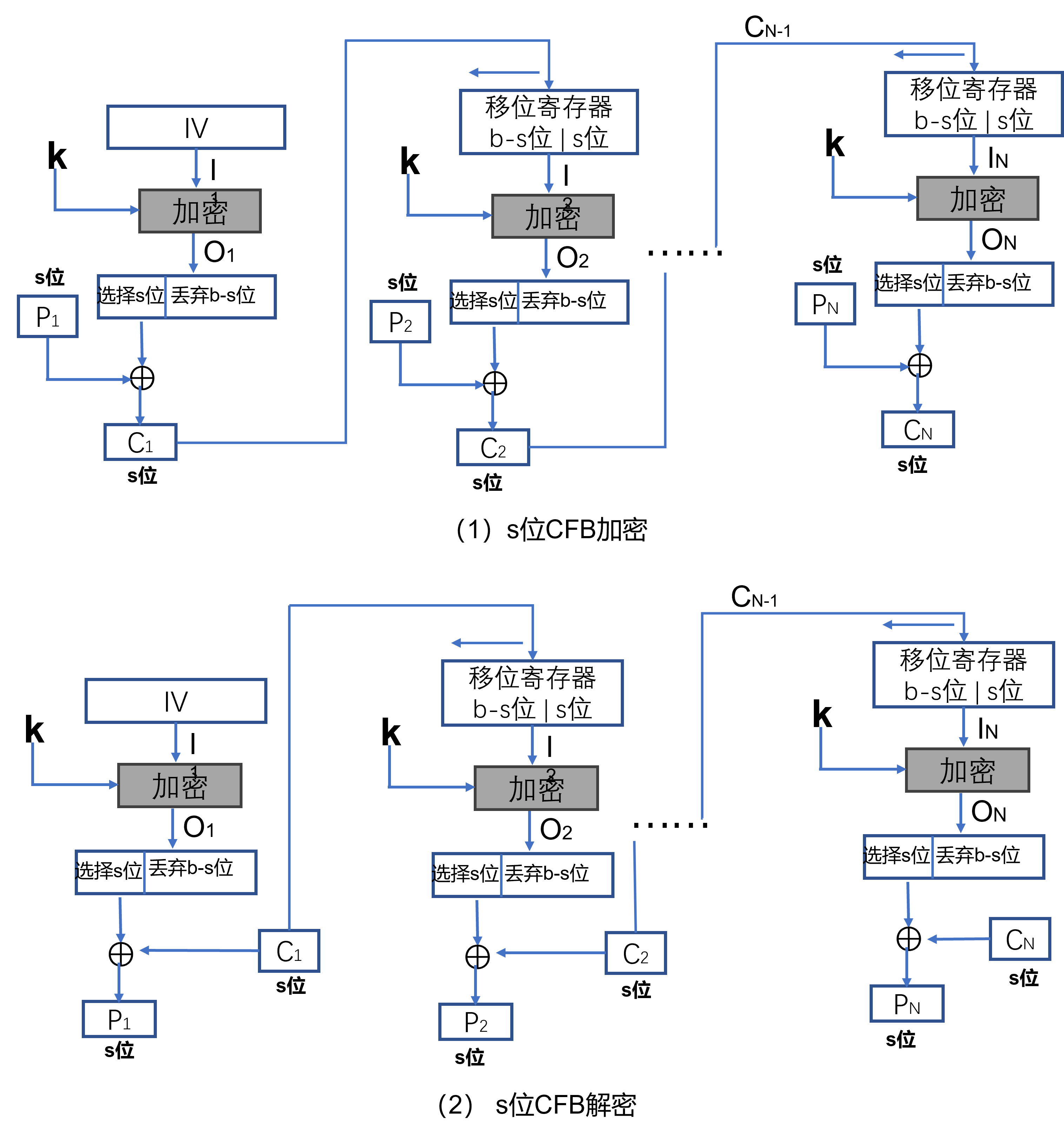 CFB 模式中,假设传输的最小单元是 s(下图以 8bits 为例)位,分组大小为 b 位(AES 分组的大小是 128bits)。首先将初始化向量 IV 放到 b 位的移位寄存器中,加密函数输出最左边的 s 位,与明文分片 P1 进行异或,得到的密文 C1 并发送,然后把移位寄存器左移 s 位,把 C1 填入寄存器最右边的 s 位开始第二个明文分片的加密。具体如下图所示。