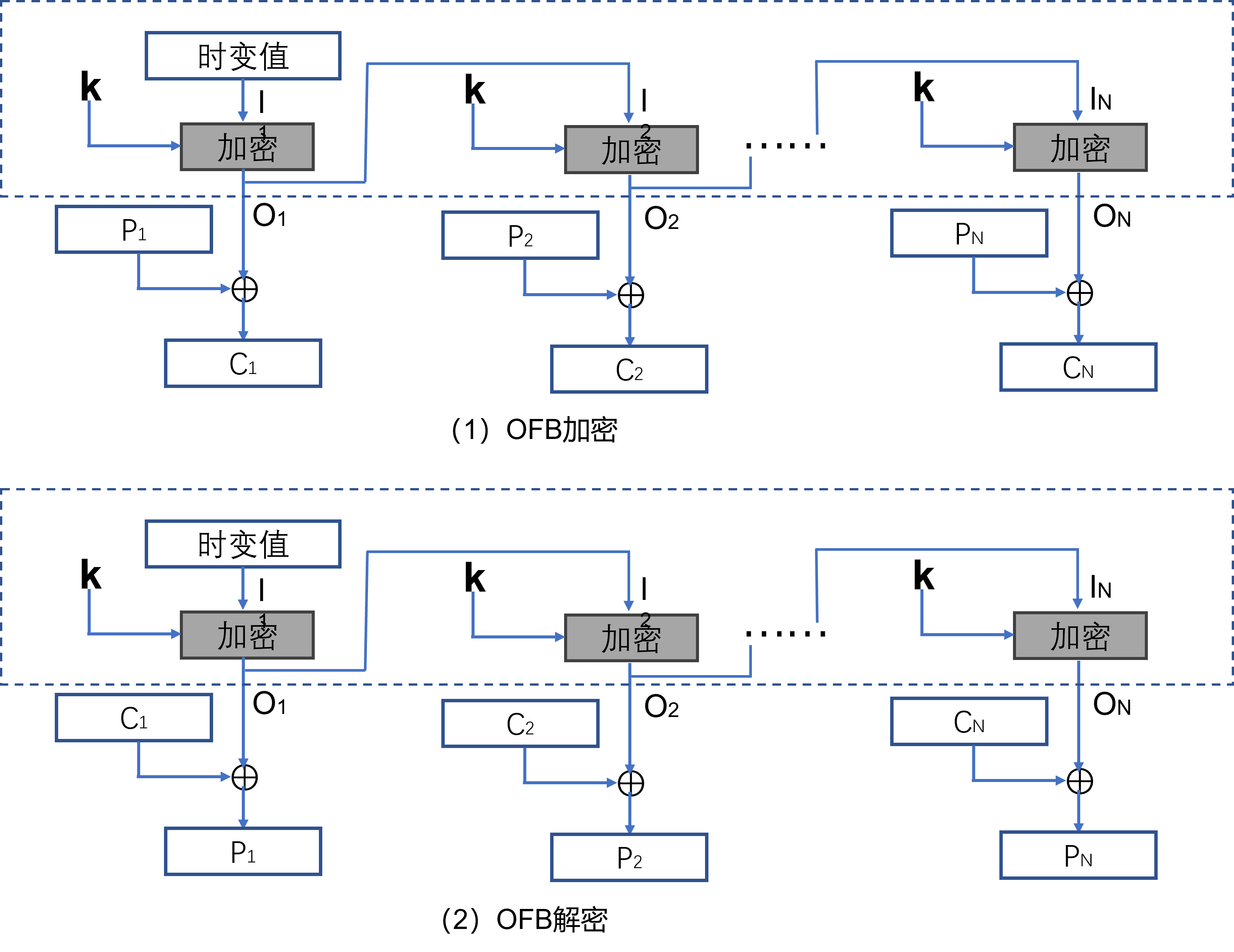 输出反馈模式(Output FeedBack, 简称 OFB):OFB 模式的结构跟上面 CFB 的模式很相似,不同的是它用加密函数的输出来填充移位寄存器,而 CFB 是用密文单元来填充移位寄存器。而且它是对这个分组来运算的。