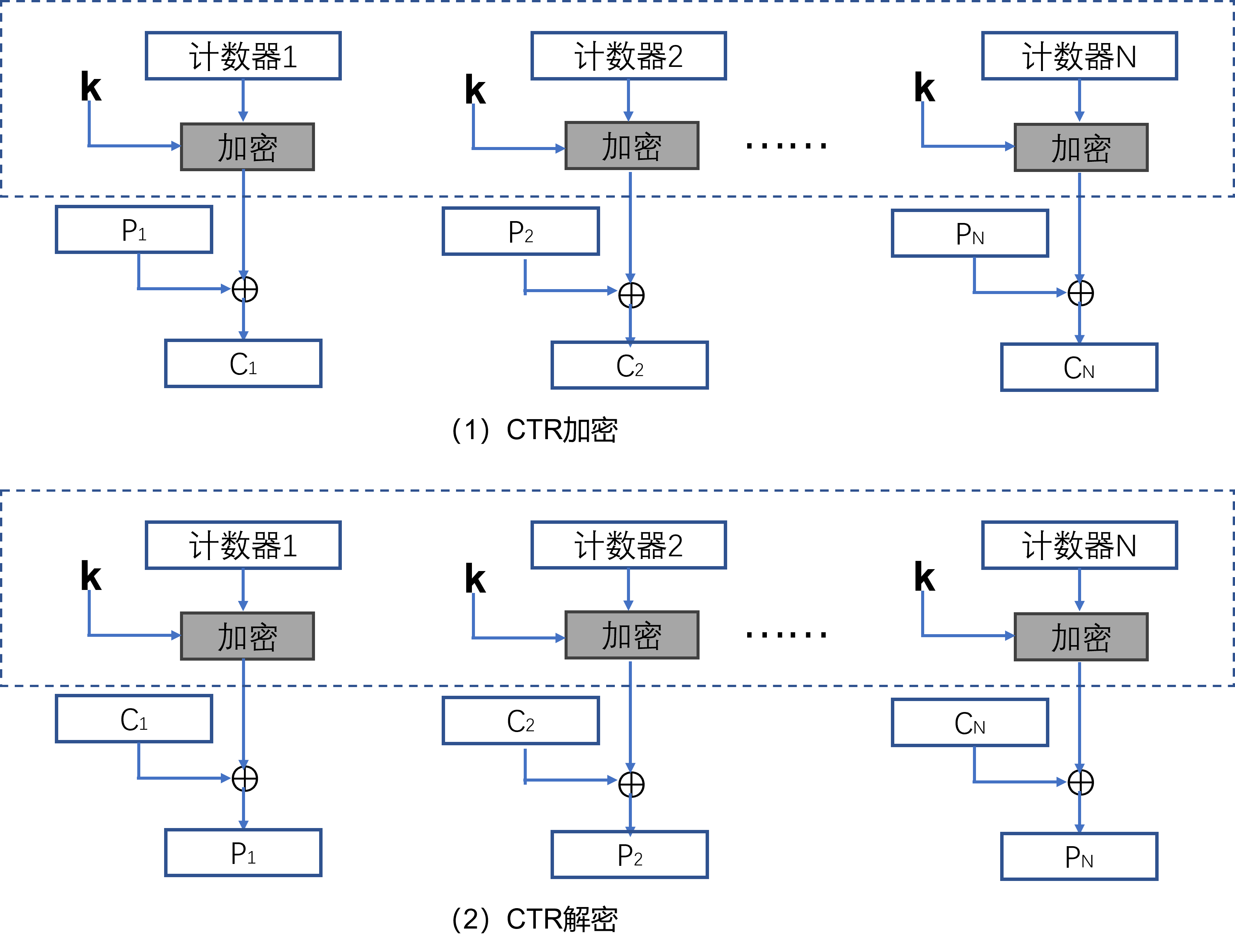 计数器模式(Counter, 简称 CTR):计数器模式使用与明文文组规模相同的长度,第一个明文分组与加密后的初始的计数器进行异或,后面随着消息块的增加计数器的值加 1。